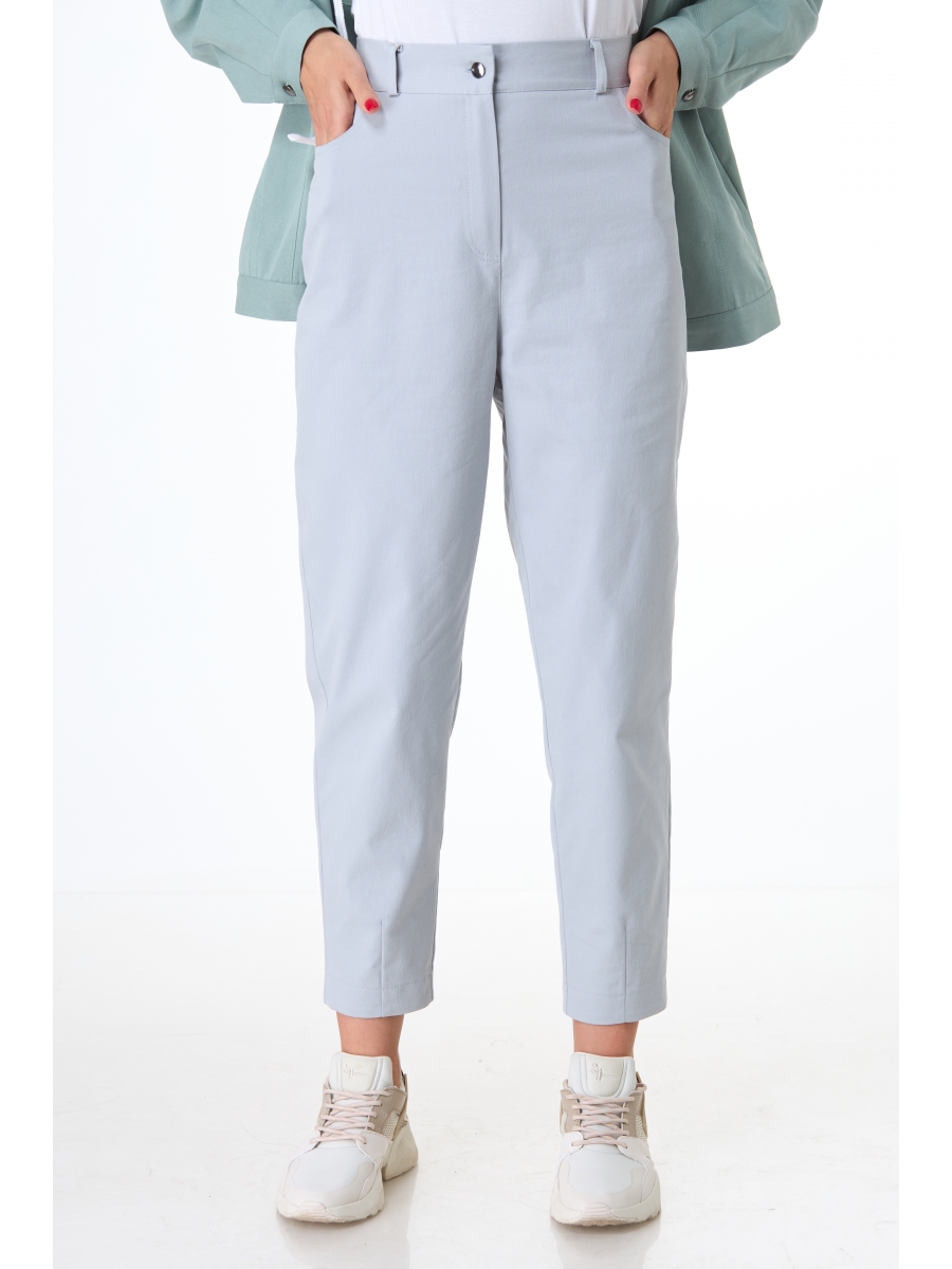 Брюки из джинсовой ткани, полуприлегающего силуэта, с посадкой на линии талии. Зауженные книзу за счёт вытачек по передним и задним частям. На передних частях брюк обработаны карманы с отрезным бочком. На задней части брюк обработаны притачные кокетки и накладные карманы. Пояс отрезной, притачной, по спинке пояс на резинке, обработаны шлевки. Застежка брюк - гульфик. Отличный выбор для каждого дня.