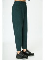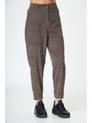 Зауженные книзу за счёт вытачек по передним и задним частям. На передних частях брюк обработаны карманы с отрезным бочком.