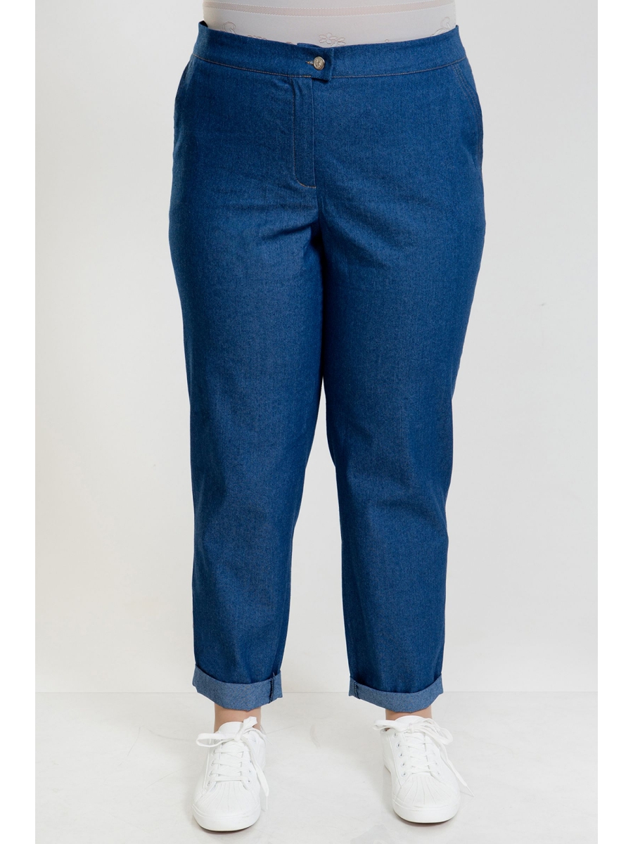 Модные брюки свободного силуэта укороченной длины. Выполнены из джинсы. Модель с комфортной высокой посадкой и комбинированным поясом, с застежкой на тесьму - молнию и пуговицу. По переду удобные наклонные карманы с листочкой.