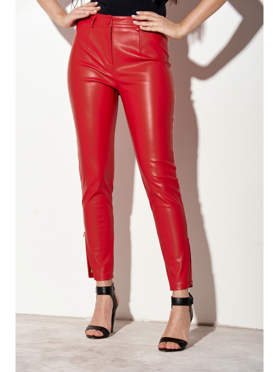 Брюки легинсы женские прилегающего силуэта с притачным поясом-обтачкой выполнены из мягкой ЭКО-кожи на замшевой основе; застежка на молнию, петлю и пуговицу; внизу вставлены функциональные потайные молнии.