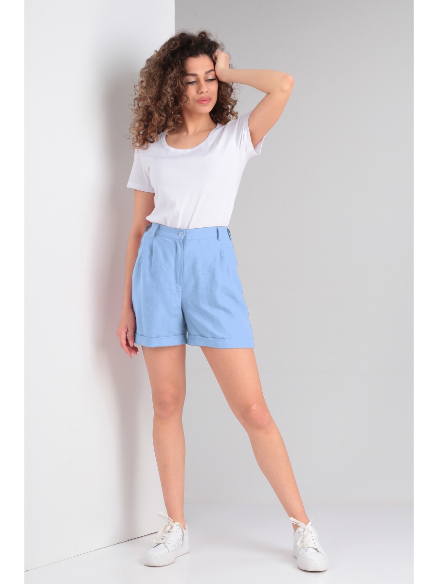 Шорты свободного силуэта с карманами, выполнены из натурального 100% льна. Пояс притачной, застежка молния, по низу отворот.