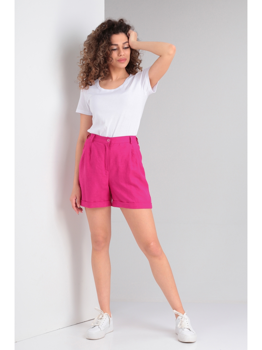 Шорты свободного силуэта с карманами, выполнены из натурального 100% льна. Пояс притачной, застежка молния, по низу отворот.