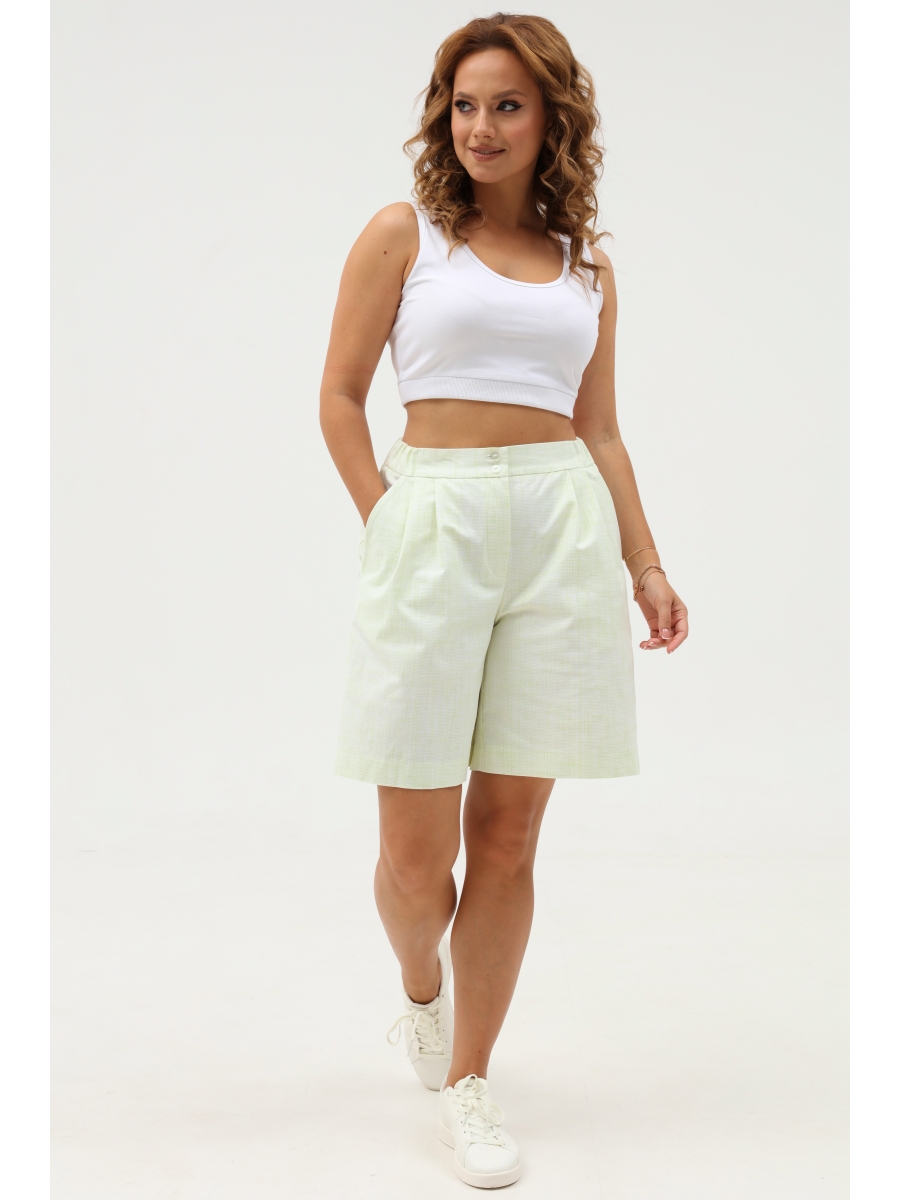 Шорты удлиненные, свободного силуэта. На передних половинках расположены симметричные мягкие складки. Пояс притачной с застежкой на молнию и пуговицу, по боковым швам со вставками эластичной тесьмы. В боковых швах - карманы "хулиганы".