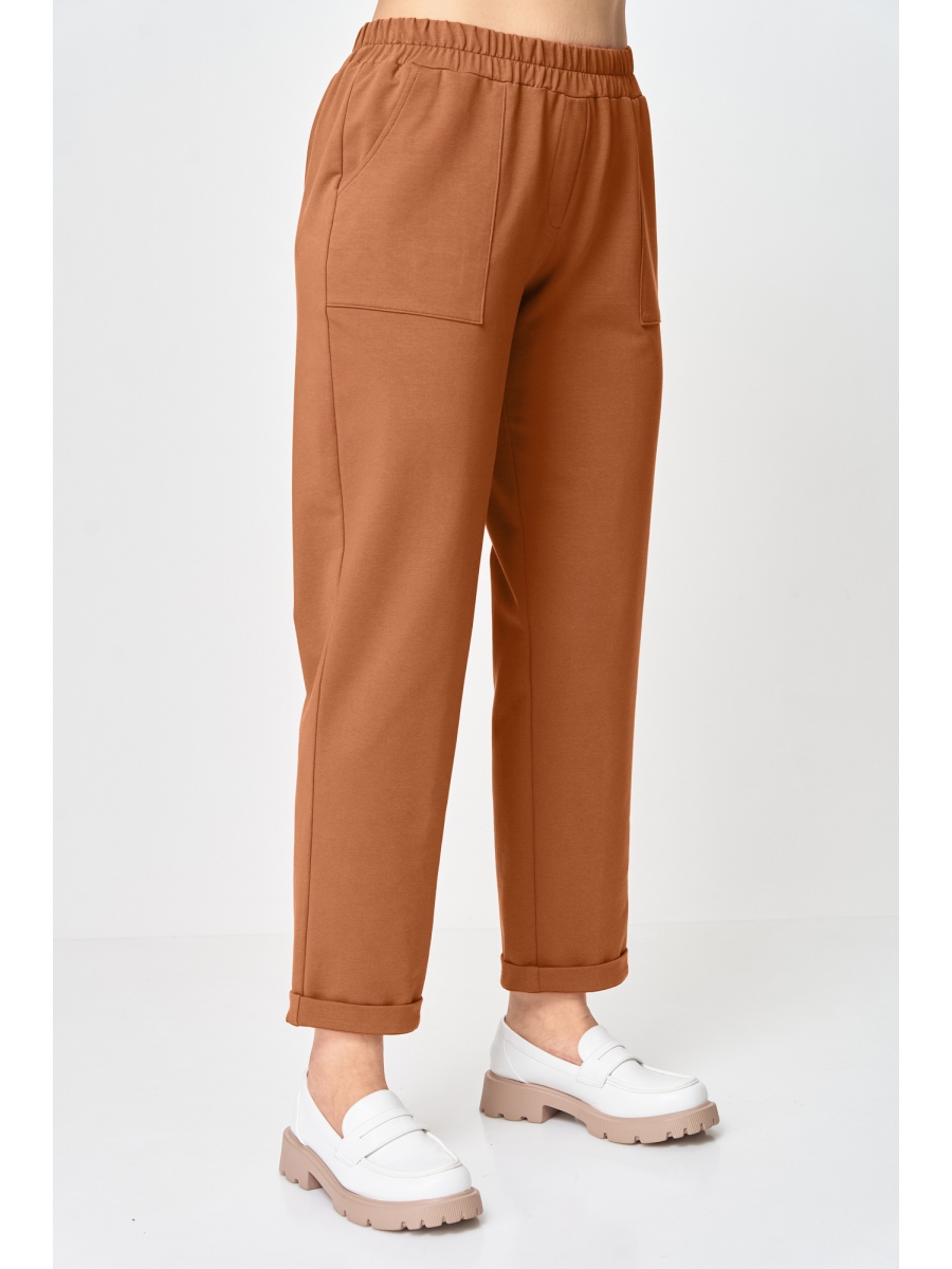 Брюки женские из трикотажной ткани (двунитка), слегка заужены к низу. По переду брюк расположены накладные карманы. На левом кармане настрочной декоративный элемент. В пояс вставлена резинка по кругу.