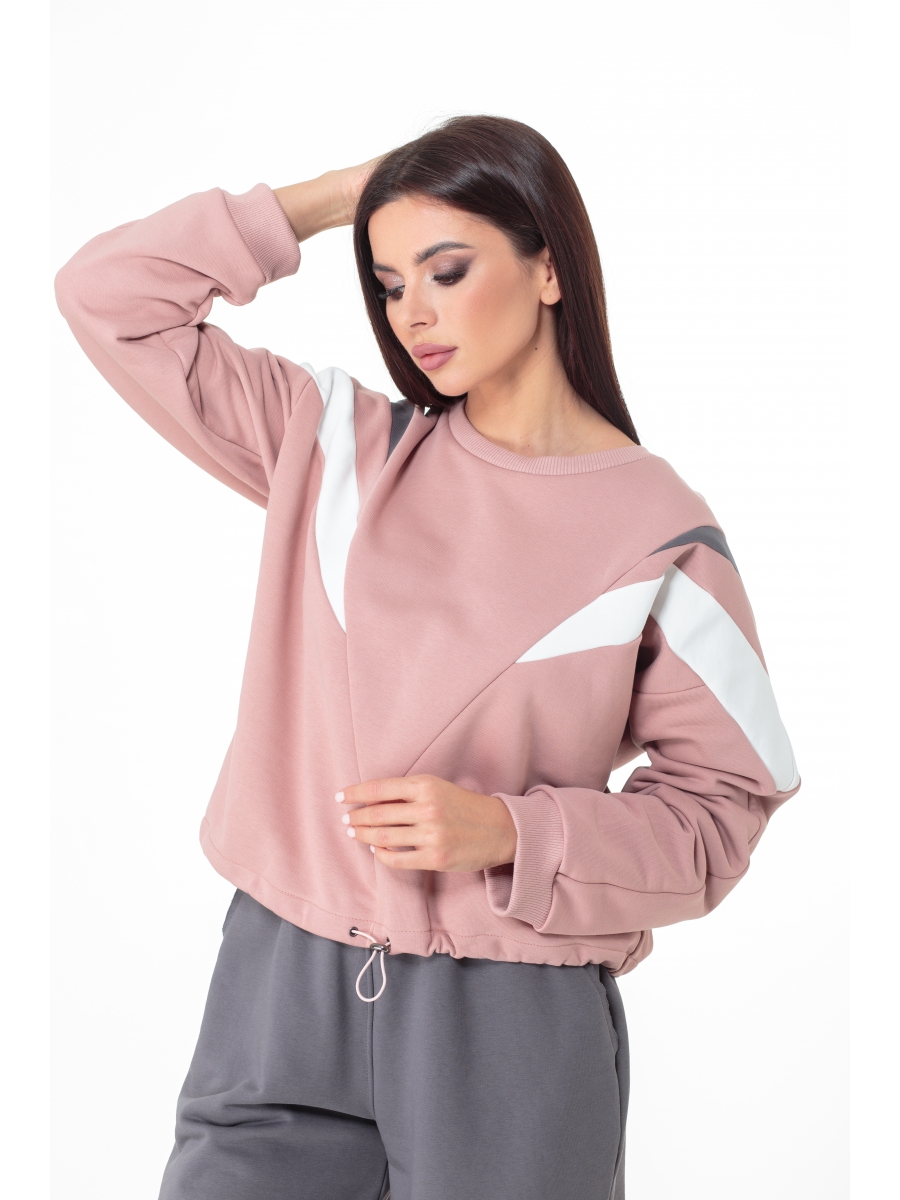 Свитшот с оригинальными подрезами пастельных тонов по переду и спинке, прямого силуэта, с длинным рукавом на манжете.