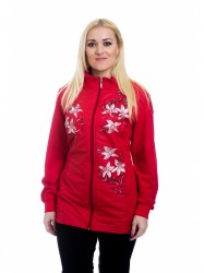 Толстовка прямого силуэта. На центральные детали переда настрочена плащевка, с нанесенным на нее печатным рисунком. Воротник-стойка. Застежка на тесьму-молнию. Рукава длинные, слегка заужены к низу, с притачными манжетами.