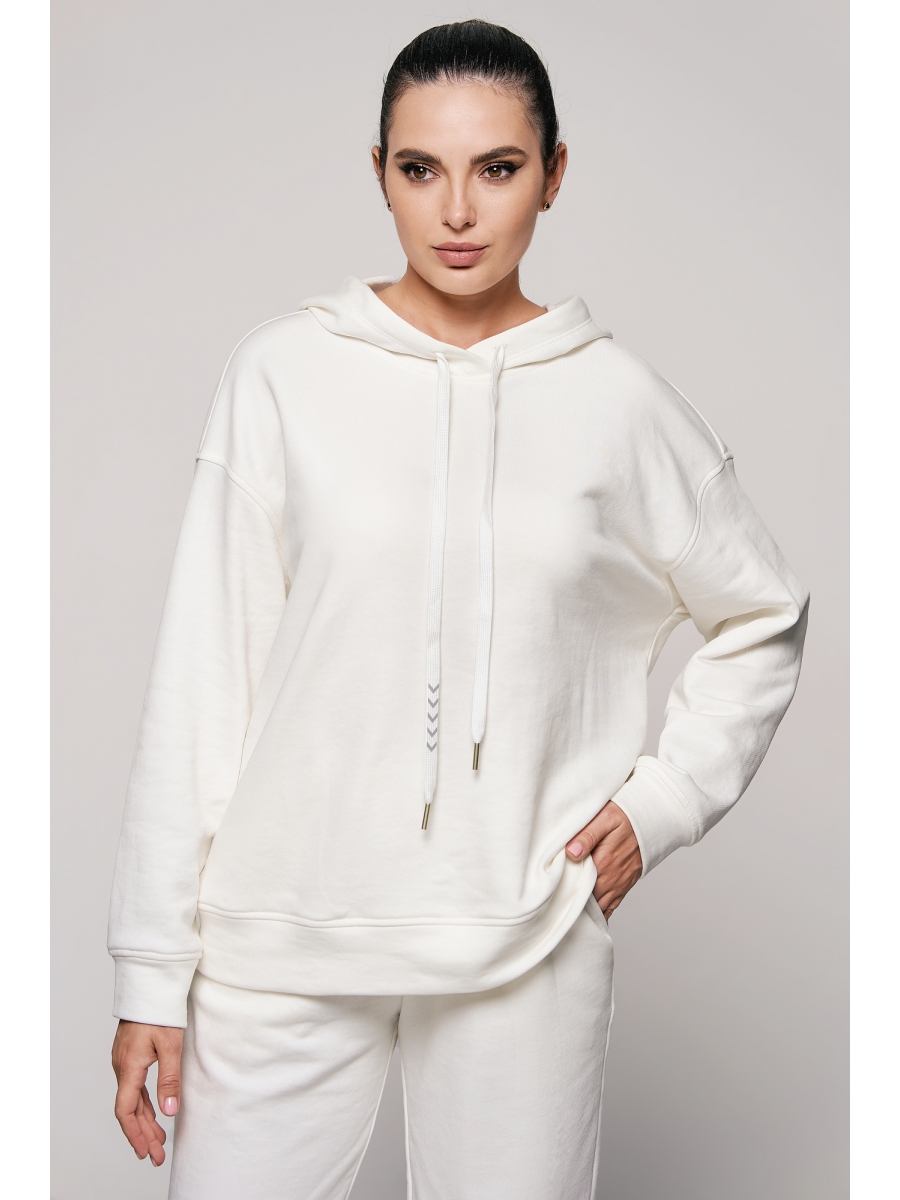 Женский худи с капюшоном свободного силуэта выполнен из высококачественного футера 3-х нитки класса "пенье". Лицевая сторона ткани гладная, изнанка - петлеобразная. Изделие имеет спущенную линию плеча и длинные рукава с углубленной проймой. Низ худи и рукавов выполнены с планками без резинок, в капюшон вставлен декоративный шнур.
