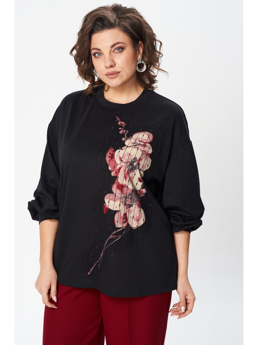 Джемпер свободного силуэта из трикотажной ткани с принтом. Рукав втачной одношовный со складками по низу и манжетой. Горловина обработана планкой. По переду поверх принта настрочена сетка с бархатным рисунком.