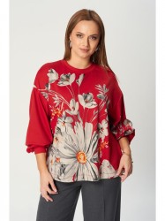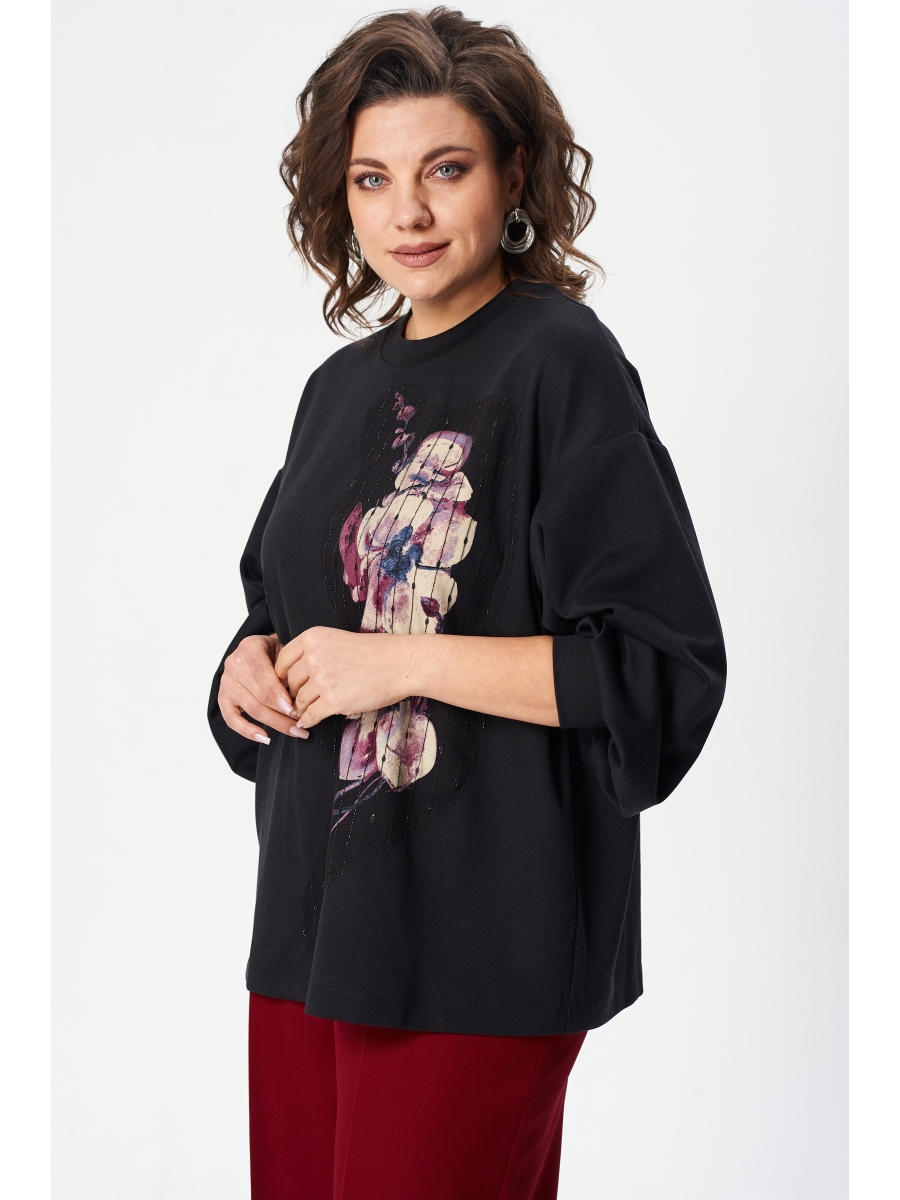 Оформить заказ →Джемпер свободного силуэта из трикотажной ткани с принтом. Рукав втачной одношовный со складками по низу и манжетой. Горловина обработана планкой. По переду поверх принта настрочена сетка с бархатным рисунком.