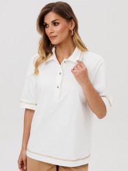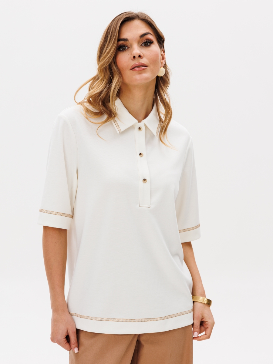 Джемпер прямого силуэта с воротником поло. Рукав втачной одношовный. По низу изделия, по низу рукава и по воротнику проложена отделочная строчка.