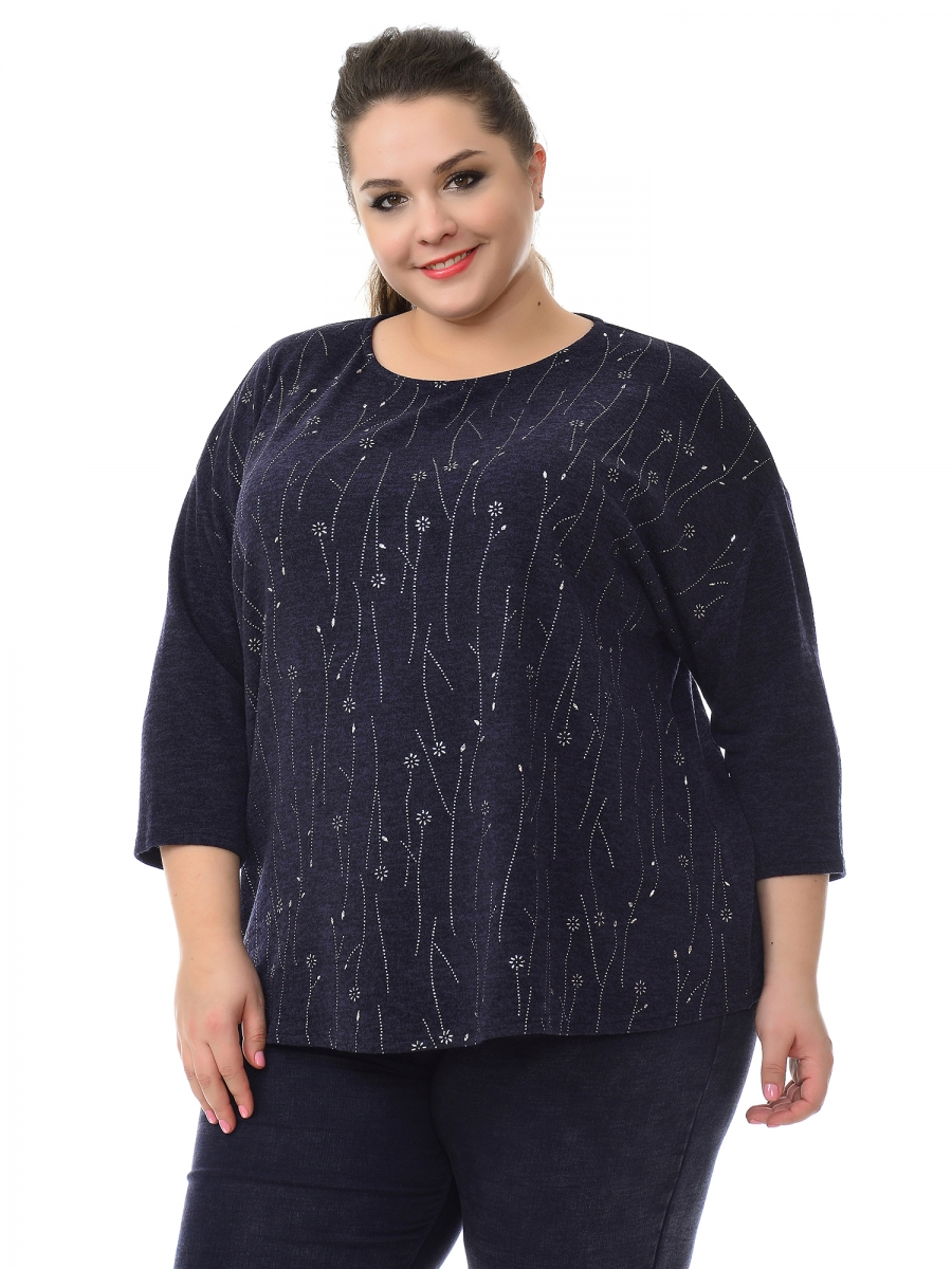Блуза свободная из искусственной ангоры. Передняя часть блузы из ткани-компаньона с серебряным напылением. Вырез горловины округлый. Рукав на основе цельнокроеного длиной 3/4.