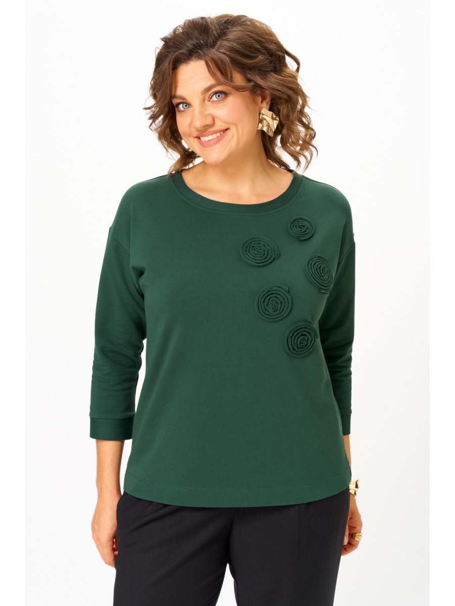 Джемпер женский из трикотажной хлопковой ткани (двунитка). По переду джемпера расположены декоративные элементы. Спущенное плечо, рукав 3/4. Низ рукава обработан манжетой. Вырез горловины круглый, оформлен бейкой.