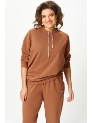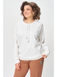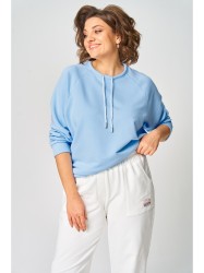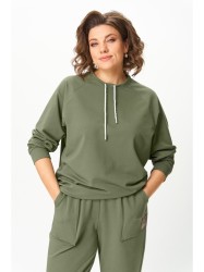 Джемпер женский из трикотажной хлопковой ткани (двунитка). Рукав реглан. Низ рукава обработан притачной манжетой. Низ изделия оформлен притачным поясом. На спинке настрочен декоративный элемент. Вырез горловины круглый, обработан бейкой со шнуром.