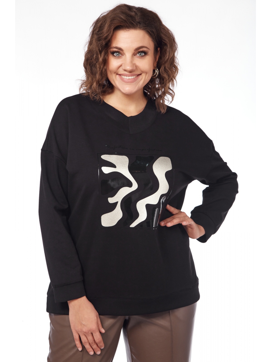 Джемпер женский прямого силуэта, изготовлен из трикотажного полотна с однотонными довязами по горловине, низу изделия и низу рукавов. Горловина V-образной формы. По переду выполнена декоративная печать. Рукав спущенный, длинный.