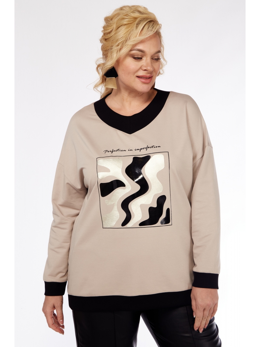 Джемпер женский прямого силуэта, изготовлен из трикотажного полотна с однотонными довязами по горловине, низу изделия и низу рукавов. Горловина V-образной формы. По переду выполнена декоративная печать. Рукав спущенный, длинный.