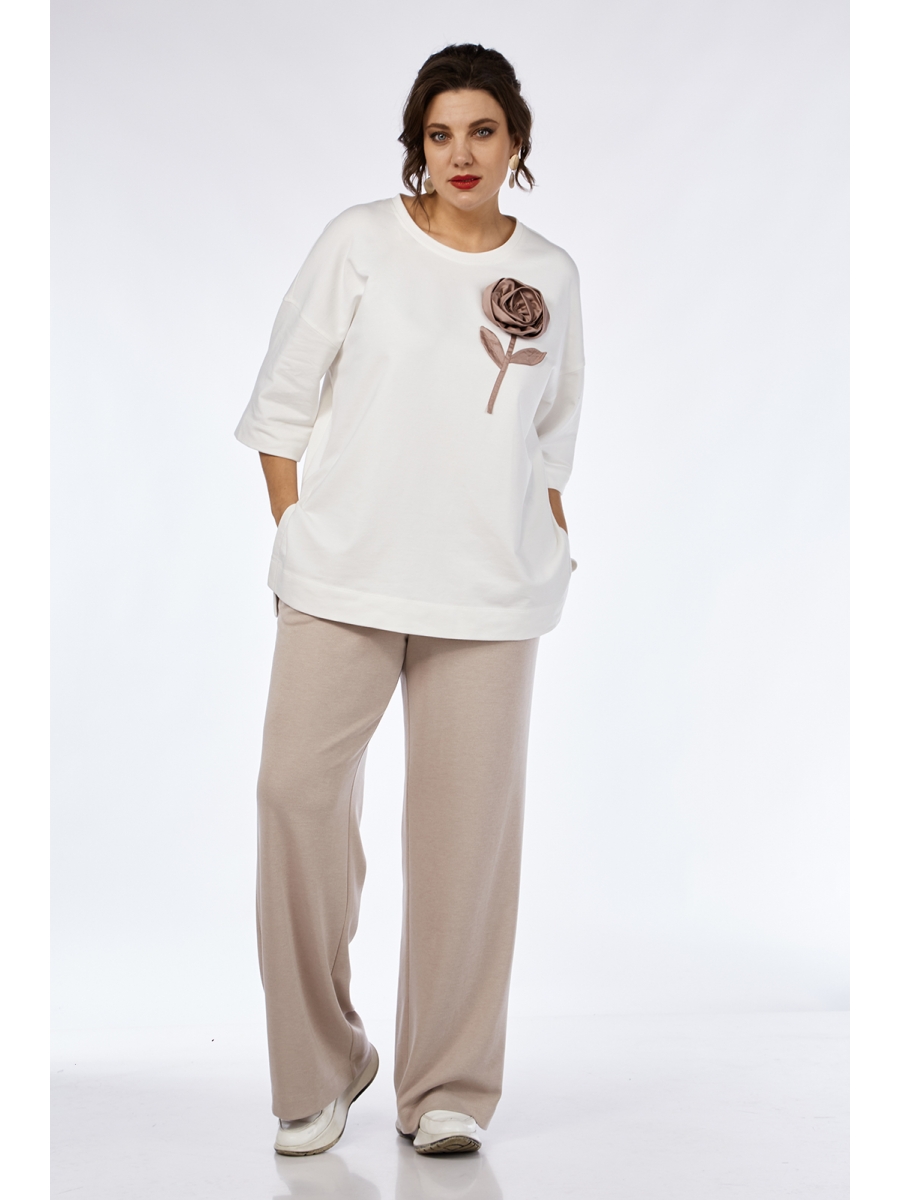 Джемпер женский, свободного кроя, изготовлен из трикотажного полотна. Горловина круглой формы. На детали полочки цветок в виде объемной аппликации. В боковых швах внизу обработаны разрезы. Рукав спущенный.