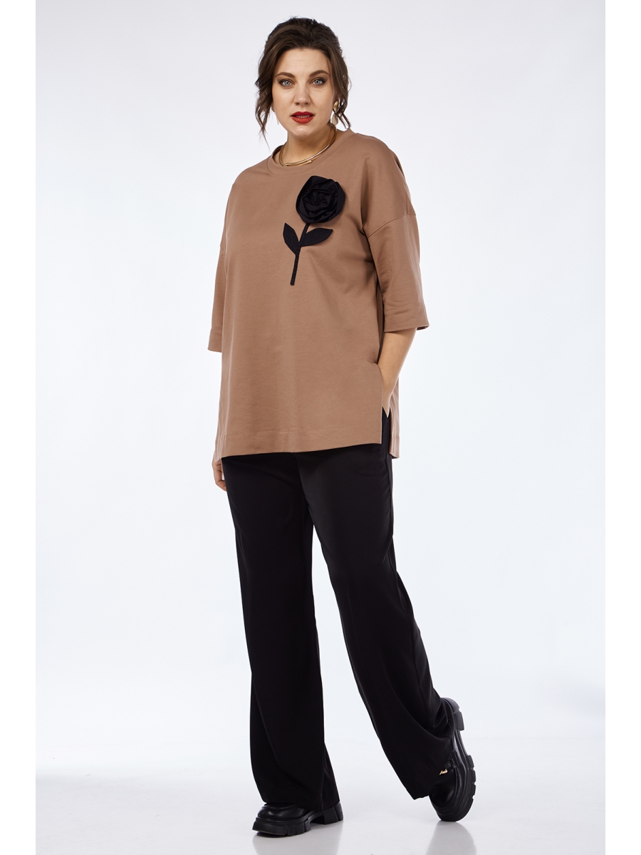 Джемпер женский, свободного кроя, изготовлен из трикотажного полотна. Горловина круглой формы. На детали полочки цветок в виде объемной аппликации. В боковых швах внизу обработаны разрезы. Рукав спущенный.