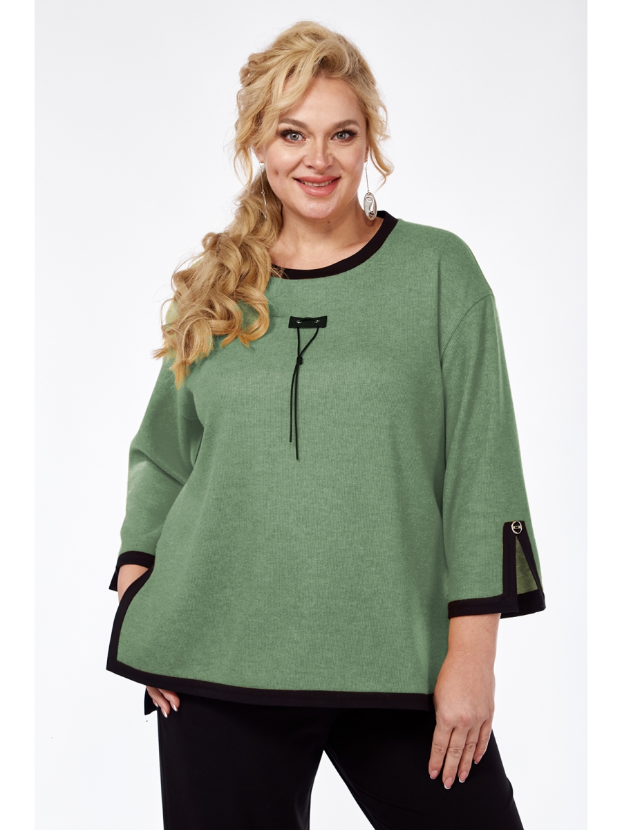 Джемпер женский свободного силуэта, выполнен из трикотажного полотна. Горловина овальной формы обработана бейкой из отделочной ткани. Перед и спинка цельнокроеные. Рукава спущенные. Нижние срезы полочки, спинки, рукавов и разрезы в боковых швах обработаны подкройными деталями из отделочной ткани. Изделие по центру переда дополнено декоративным элементом.