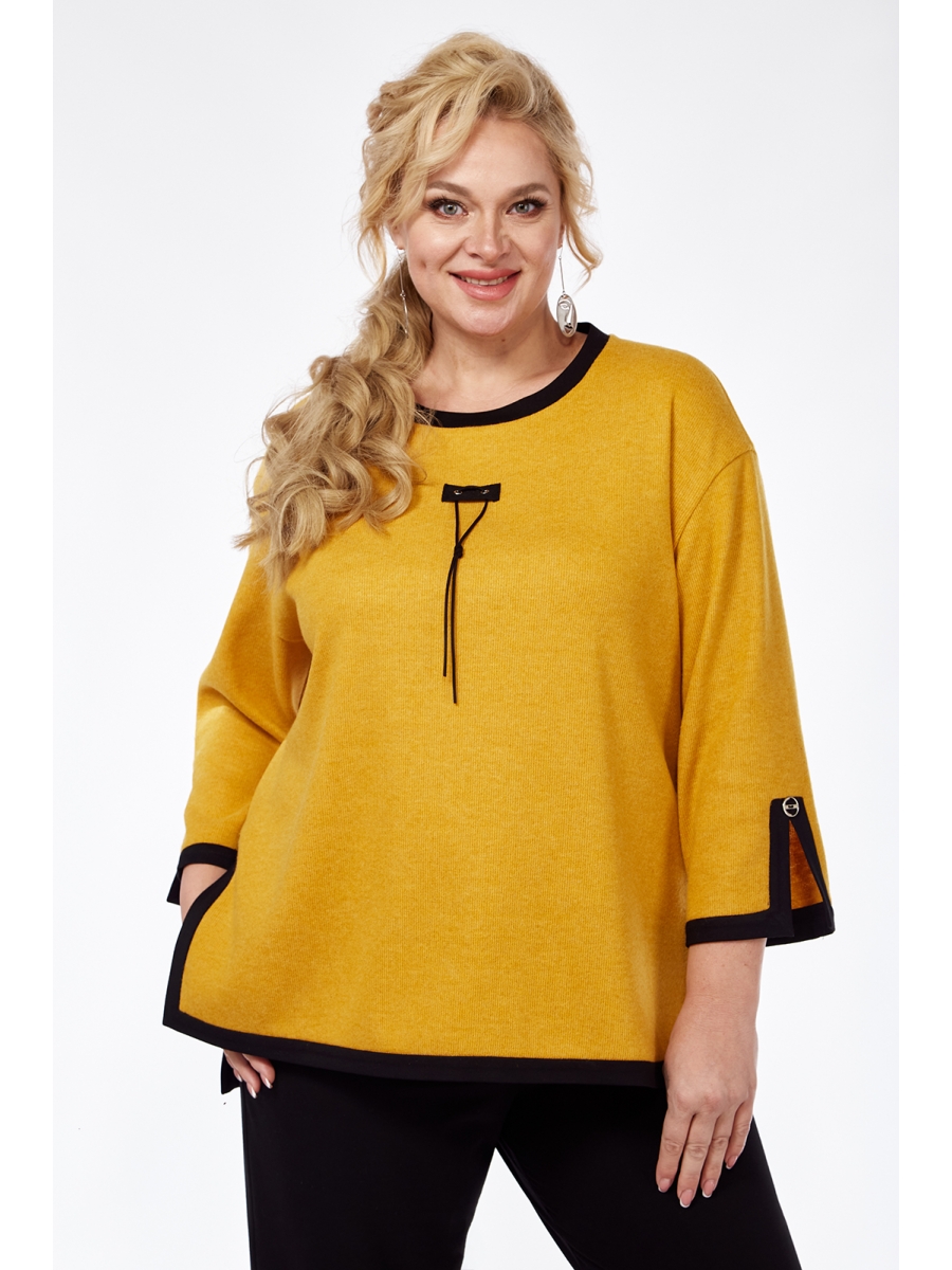 Джемпер женский свободного силуэта, выполнен из трикотажного полотна. Горловина овальной формы обработана бейкой из отделочной ткани. Перед и спинка цельнокроеные. Рукава спущенные. Нижние срезы полочки, спинки, рукавов и разрезы в боковых швах обработаны подкройными деталями из отделочной ткани. Изделие по центру переда дополнено декоративным элементом.