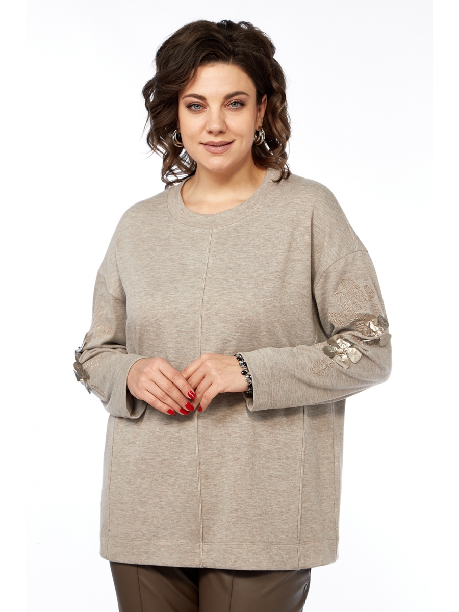 Джемпер свободного силуэта, выполнен из трикотажного полотна. Горловина обработана планкой. Перед с центральным швом и боковыми рельефами, которые декоративно отстрочены. Рукава спущенные декорированы вышивкой с отлетными цветами.