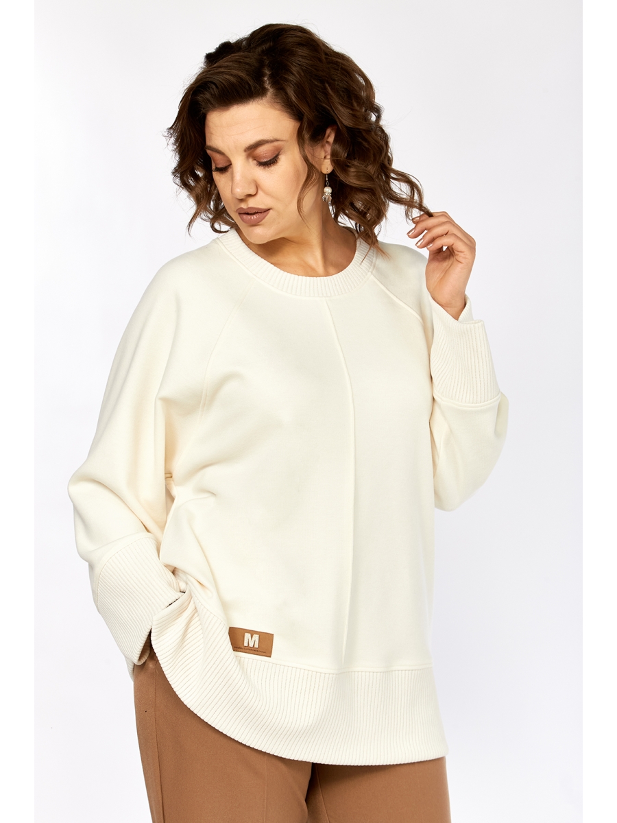 Джемпер женский, свободного кроя, изготовлен путем комбинирования трикотажного полотна. Горловина круглой формы. Рукава — реглан. В боковых швах обработаны разрезы внизу. Горловина, низ изделия и низ рукавов изготовлены из отделочного трикотажного полотна. Отделка нашивка по переду.