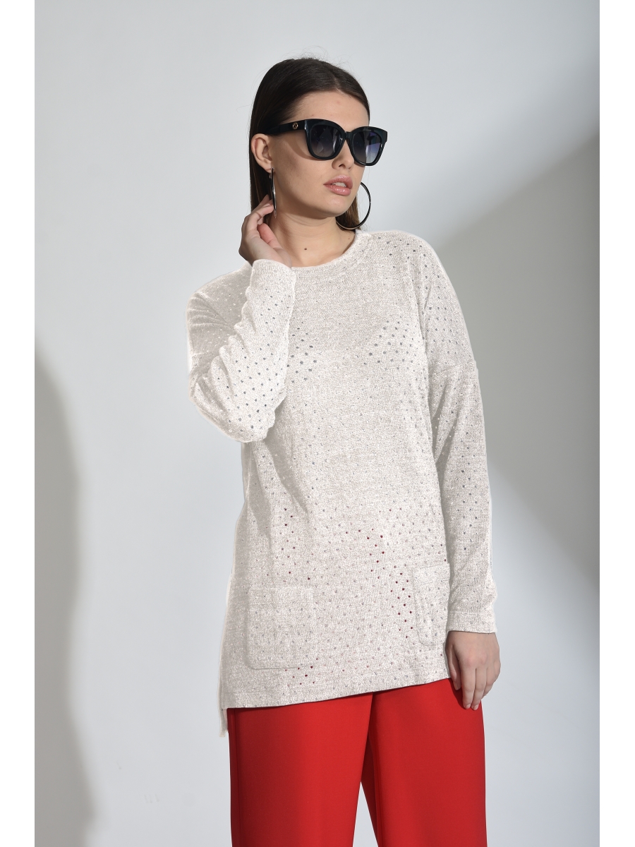 Трикотажное полотно средней плотности, произведенное из волокон шерсти, вискозы, полиэстера, ткань мягкая и приятная на ощупь. Горловина - «лодочка», прямой силуэт, ассиметричного фасона с боковыми вырезами.