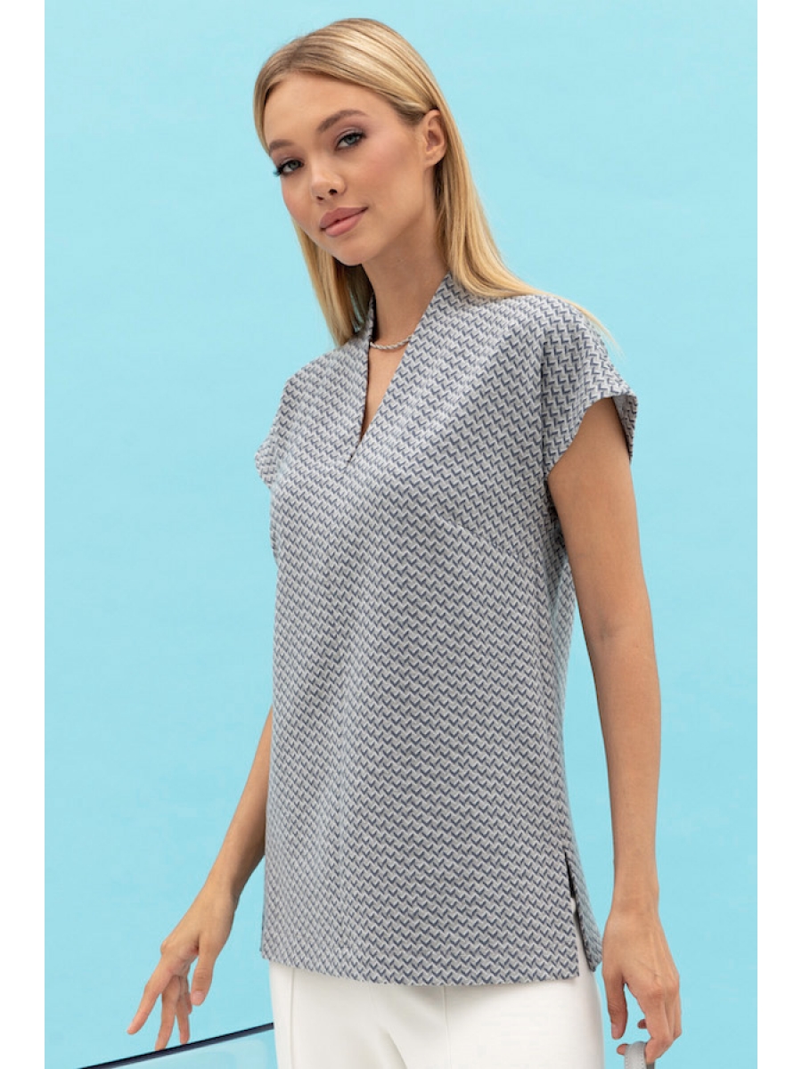 Джемпер из эластичного полотна с жаккардовым узором. Свободный силуэт, с разрезами в боковых швах. По центру передней и задней части изделия выполнен шов. Цельнокроеная стойка, переходящая в V-образный вырез горловины, визуально делает фигуру стройнее. Цельнокроеный короткий рукав