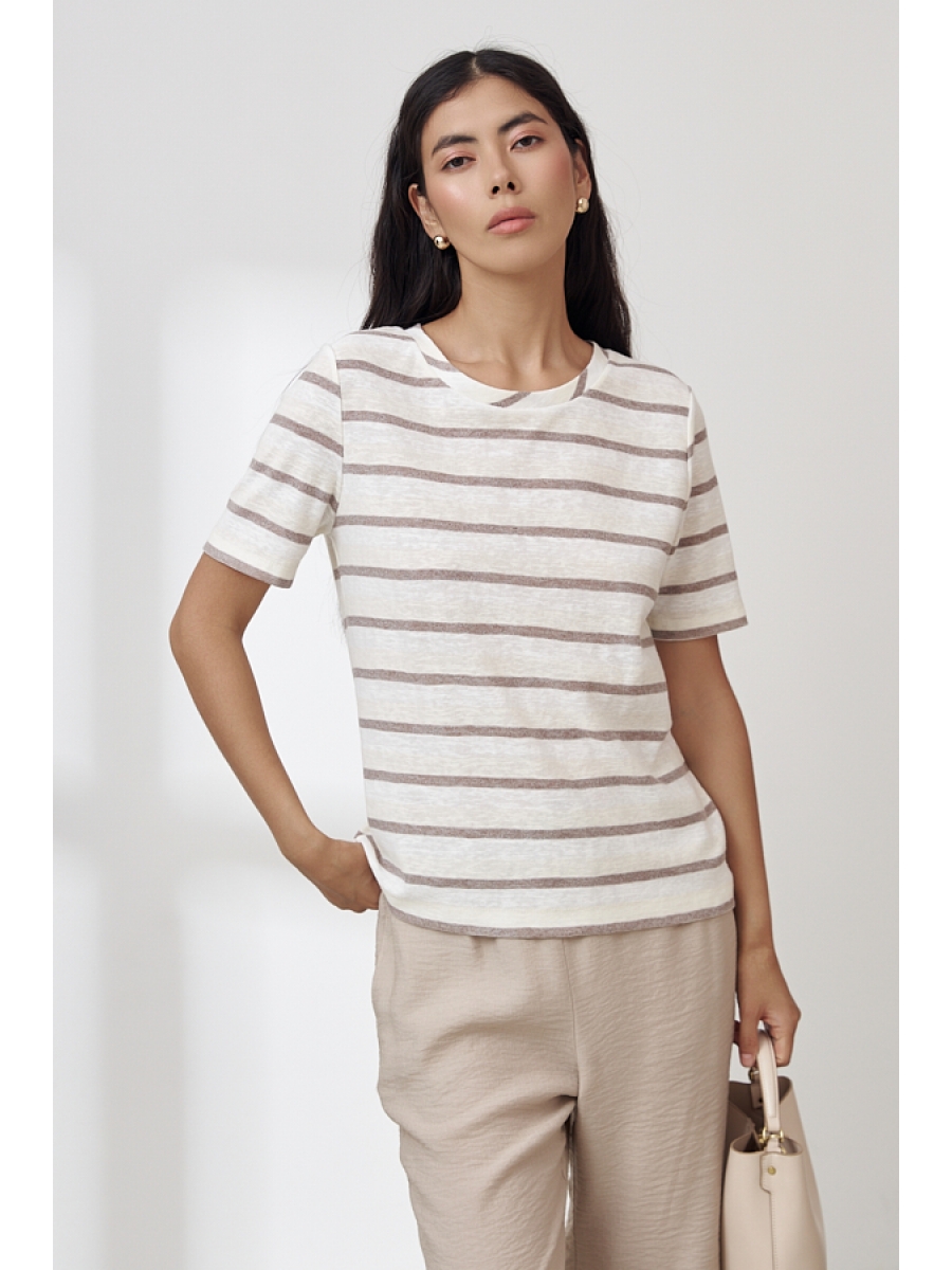 Джемпер из эластичного полотна полуприлегающего силуэта. Втачной короткий рукав. Вырез горловины окантован эластичной бейкой. Джемпер – это хорошая базовая вещь, подходящая для любого гардероба.