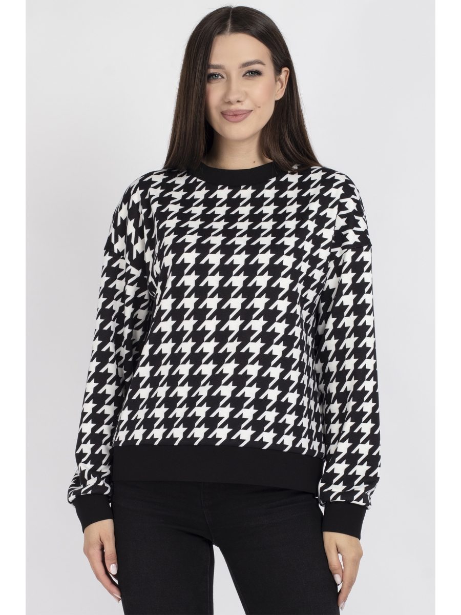 Джемпер женский прямого силуэта со спущенным плечом. Передняя часть и спинка изделия выполнены цельными. Горловина джемпера с притачной планкой. Низ рукава и изделия также имеет притачную планку, что придает дополнительный акцент. Этот джемпер позволит вам выразить свою индивидуальность и создать модный и стильный образ. Изготовленный из высококачественного материала, этот женский джемпер обеспечит вам максимальный комфорт в любое время года. Дизайн этого джемпера особенно привлекателен благодаря принту в виде гусиной лапки.