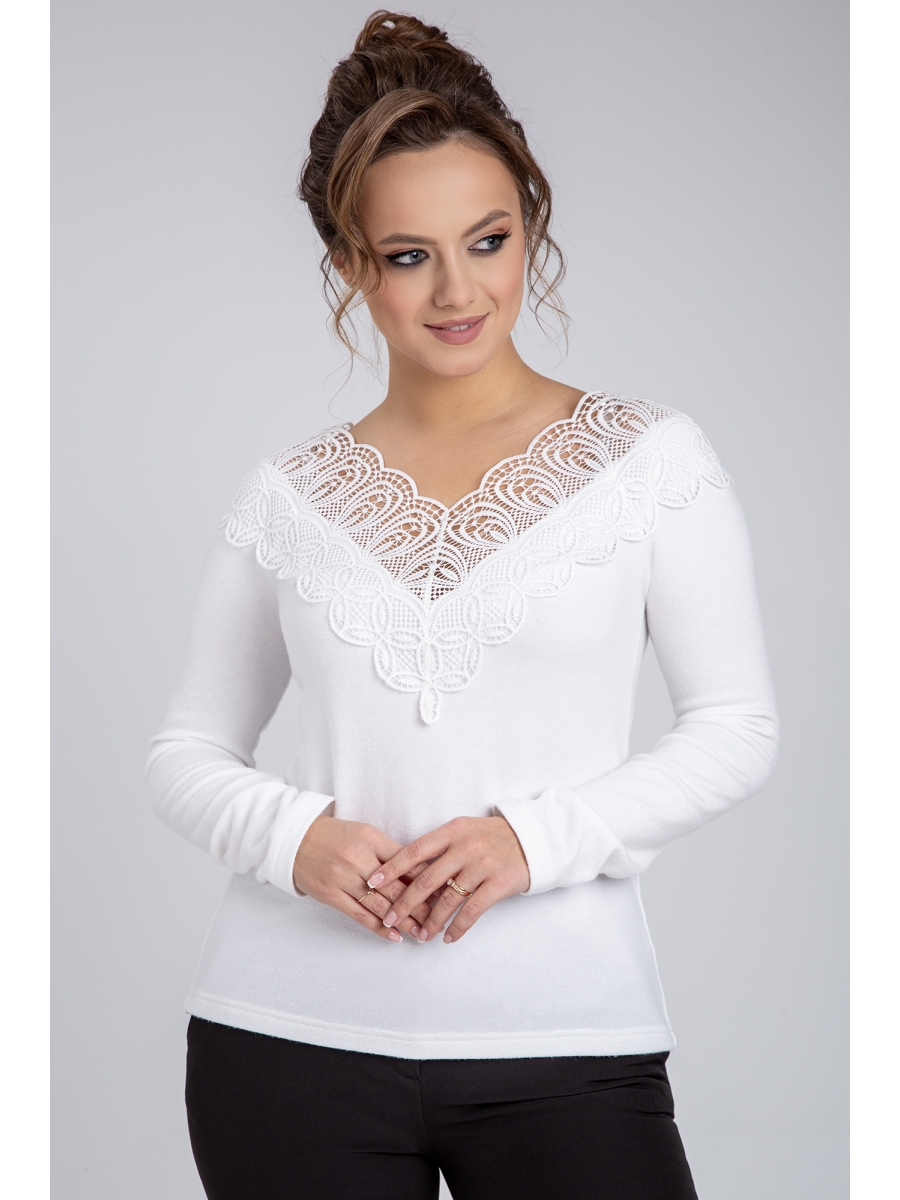 Джемпер женский полуприлегающего силуэта. Перед и спинка цельные. Отделочным элементом является кружево настроченное по переду и спинке горловины. Рукав реглан.