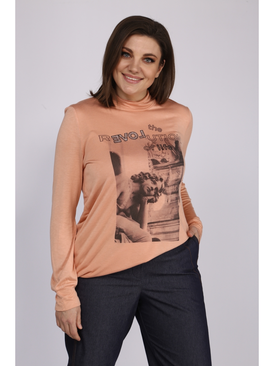 Джемпер женский прямого силуэта из вискозной ткани. Рукав втачной, одношовный с притачной манжетой. Перед и спинка двойные. По передней части изделия декоративная печать.