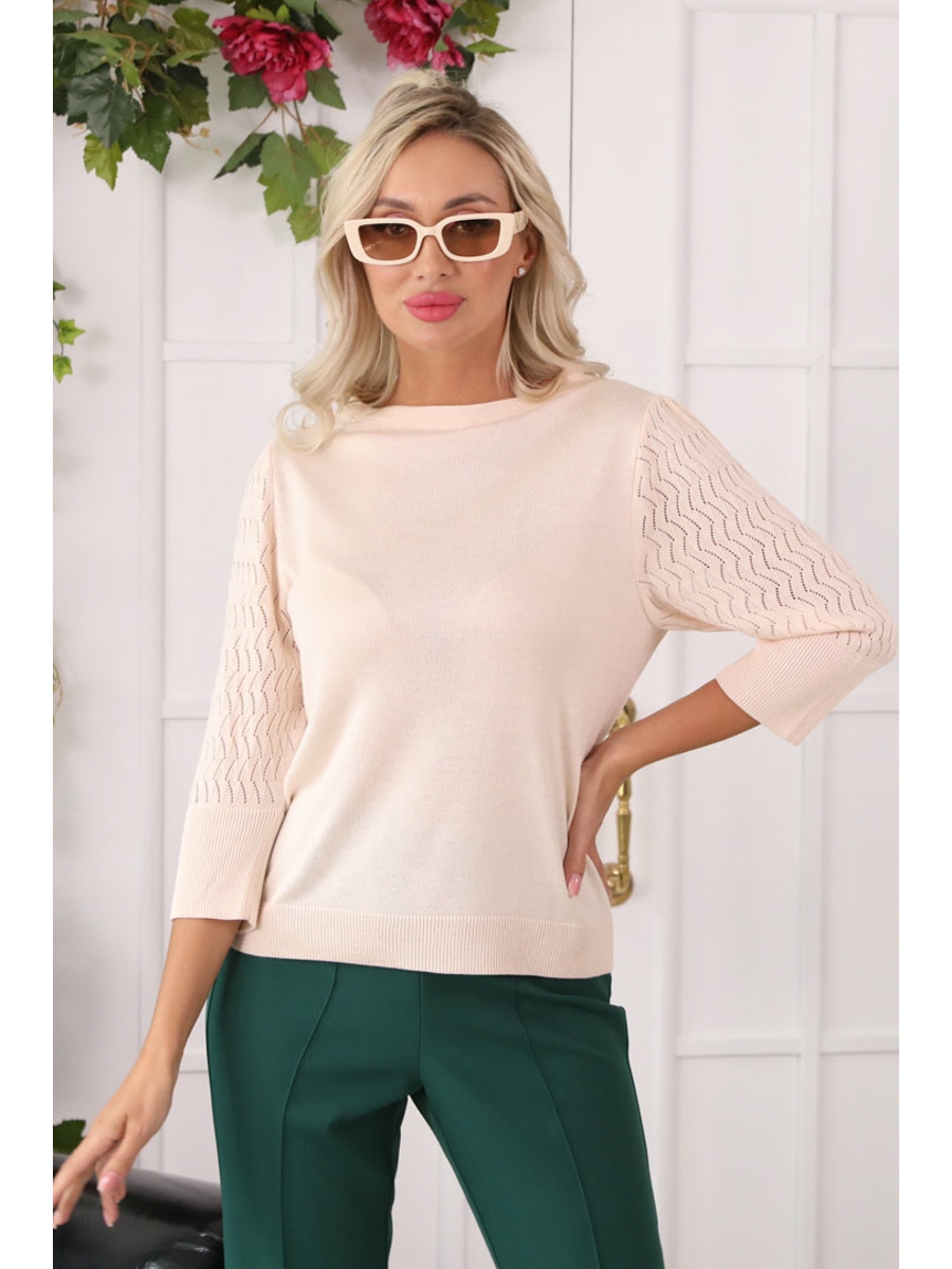 Изящный вязаный джемпер кремового цвета, прямого силуэта, с тонким, плотным переплетением. Джемпер с вырезом лодочка. Втачные рукава вывязаны фантазийным рисунком. По низу изделия и рукавов - манжеты. Рост фотомодели — 170 см.