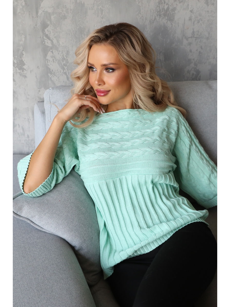 Стильный джемпер прямого силуэта мятного цвета. Изделие выполнено в технике "ручного вязания" из нитей с содержанием хлопка. Вырез горловины изделия в форме "лодочка". По рукавам вывязан рисунок "косы", перед и спинка имеют рисунок - "лапша". Низ рукавов и низ изделия обработаны манжетами в технике "резинка".