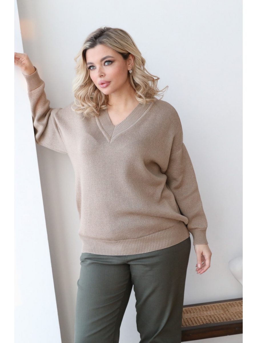Эффектный джемпер свободного силуэта бежевого цвета. Джемпер выполнен в технике «ручного вязания» из натуральных хлопковых нитей. V-образный вырез изделия обработан двусторонней лицевой бейкой. Низ изделия и втачные рукава обработаны манжетами, выполненные в технике «резинка».