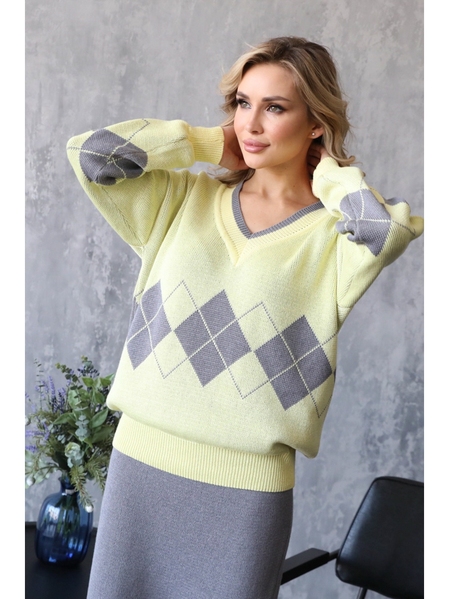 Эффектный джемпер свободного силуэта желтого цвета. Джемпер выполнен в технике «ручного вязания» из натуральных хлопковых нитей. V-образный вырез изделия обработан двусторонней лицевой бейкой. Низ изделия и втачные рукава обработаны манжетами, выполненные в технике «резинка».