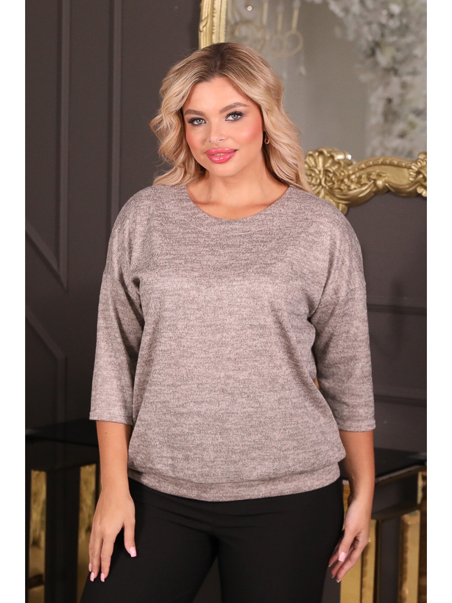 Очаровательная блузка свободного силуэта из трикотажного полотна бежевого цвета. Круглый вырез изделия обработан внутренней обтачкой. Блузка со спущенной линией проймы и втачными рукавами. По низу изделия манжет. Длина изделия по спинке от плечевого шва до низа изделия — 68 см. Рост модели - 170 см.