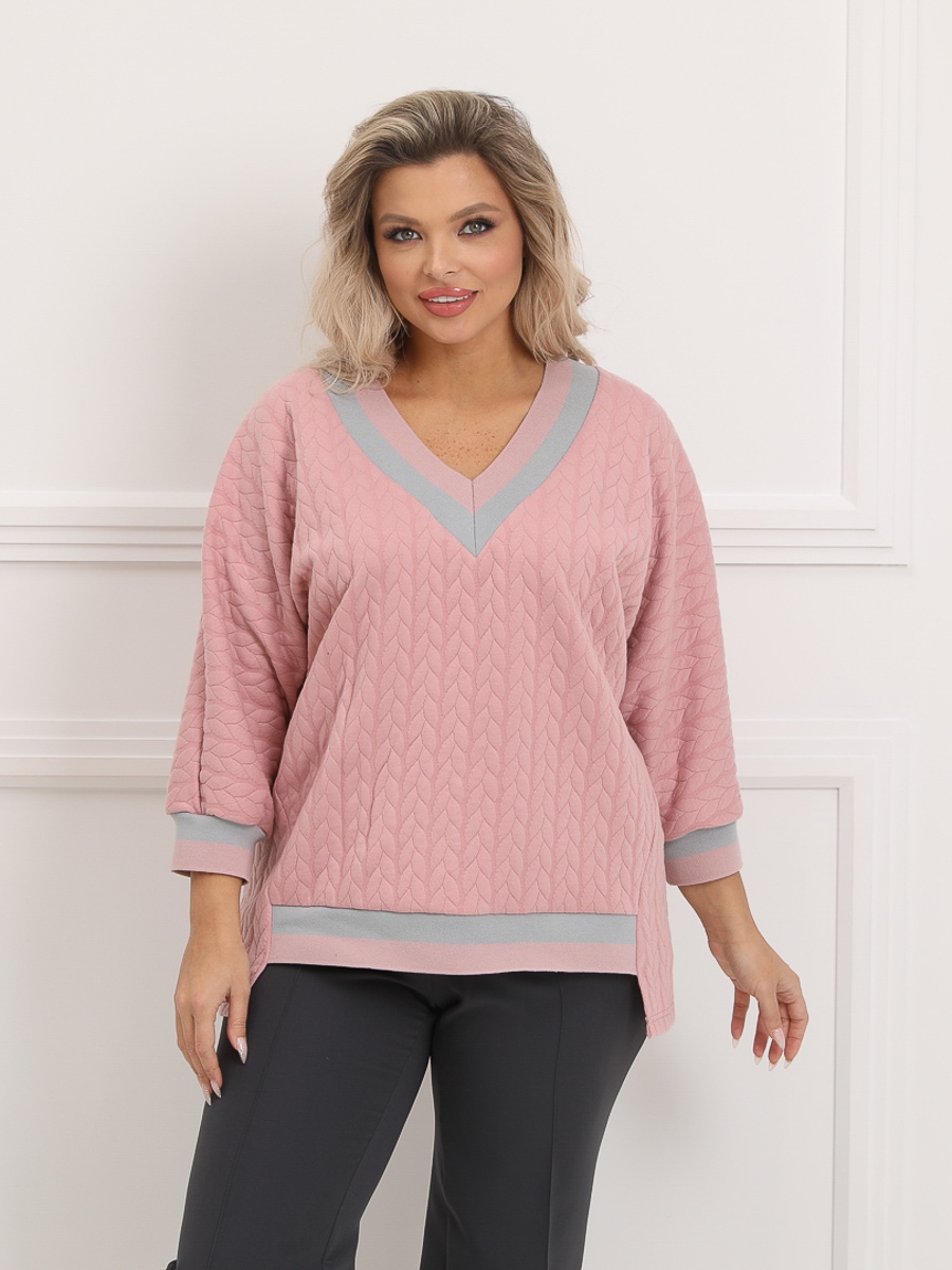 Стильный джемпер прямого силуэта из трикотажного полотна. V-образный вырез изделия, цельнокроеные рукава и низ переда изделия обработаны декоративными подвязами. Длина изделия по спинке от плечевого шва до низа изделия — 69 см. Рост фотомодели — 170 см.