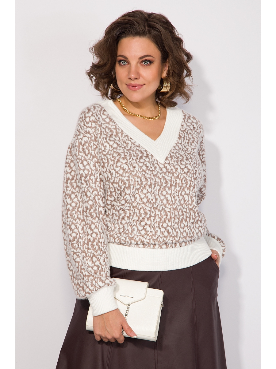 Мягкий, уютный джемпер, выполнен из трикотажного полотна по типу «ангоры» с оригинальным принтом. Модель с V-образным вырезом горловины на мягкой отделочной планке. Рукав полной длины, на спущенном плечевом поясе. Низ изделия и рукава оформлен мягкой манжетой в сгиб для комфортного прилегания. Спинка без особенностей.