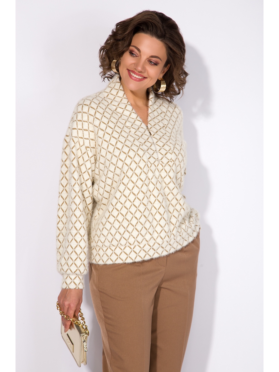 Мягкий и уютный джемпер в стиле «OLD MONEY» выполнен из трикотажа с эффектом ангоры с рисунком. Эффектная V-образна горловина, переходящая в мягкую стойку. Плечевой пояс спущенный, с рукавом полной длины. Низ изделия и низ рукава оформлен притачными манжетами из основной ткани. Спинка без особенностей. Идеальный выбор для стильных женщин, кто ищет уют и комфорт. Если вы ищете модную вещь без лишних деталей — это ваш вариант!
