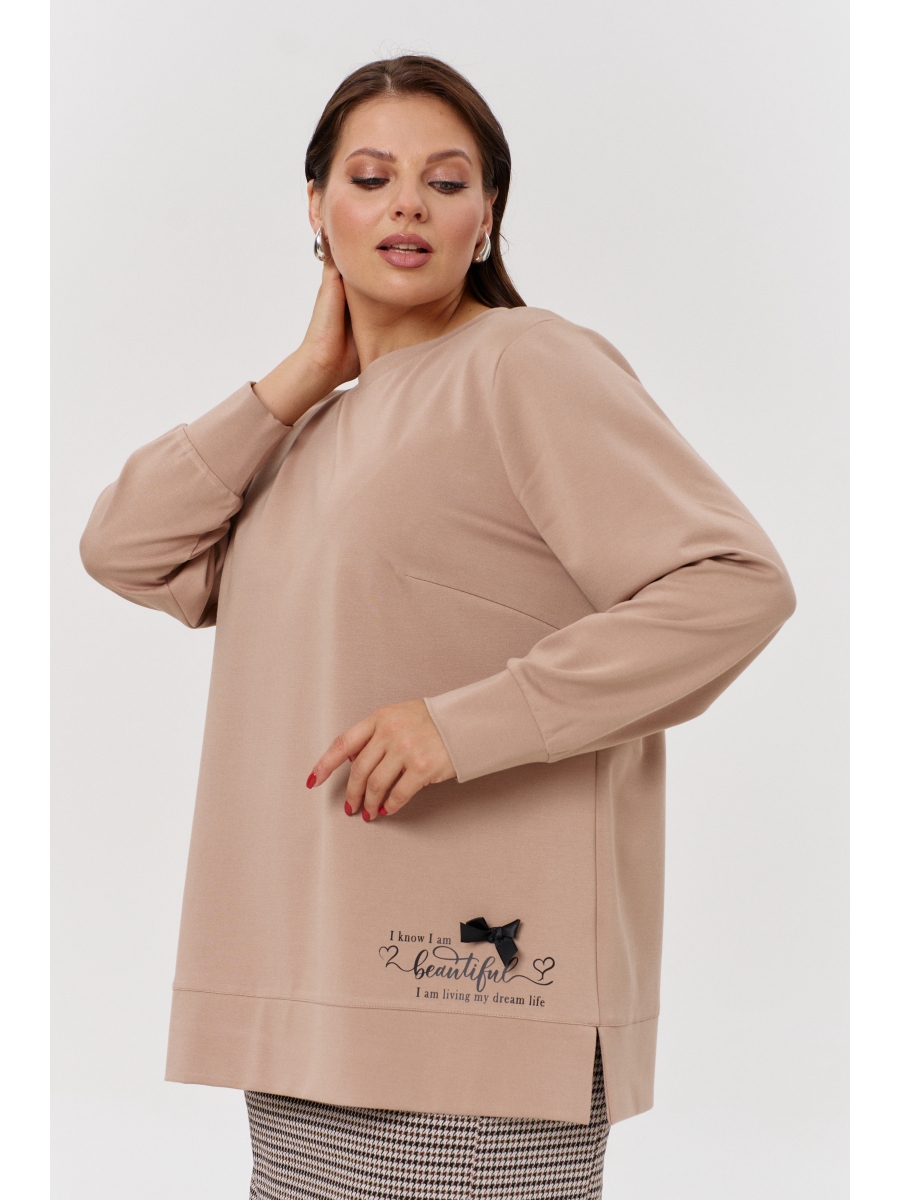 Джемпер свободного покроя с круглой горловиной. Рукав втачной, полномерный по обхвату, на манжете. Низ джемпера тоже на манжете. Для удобства в боковых швах разрезы. Внизу на полочке оригинальная печать и пришивной декор в виде атласного бантика.