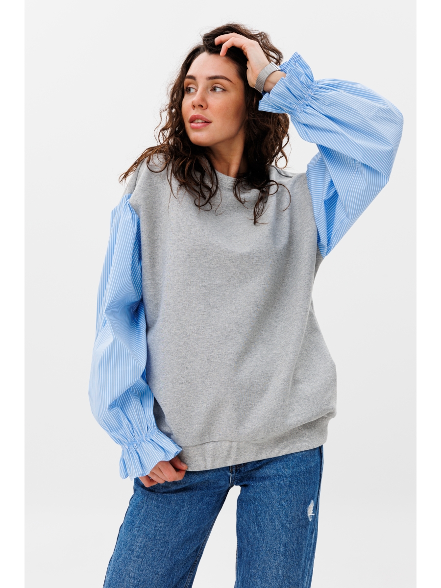 Стильный женский джемпер из качественного футера 3-х нитка и блузочной ткани на рукавах. Джемпер свободного силуэта, округлая горловина, плечо приспущено, рукав объемный расширенный, собран на тонкую резинку, за счет сборки создается эффект «рюши». Низ джемпера и горловина из кашкорсе. ​​​Джемпер можно с легкостью комбинировать с различными вещами и обувью Вашего гардероба.