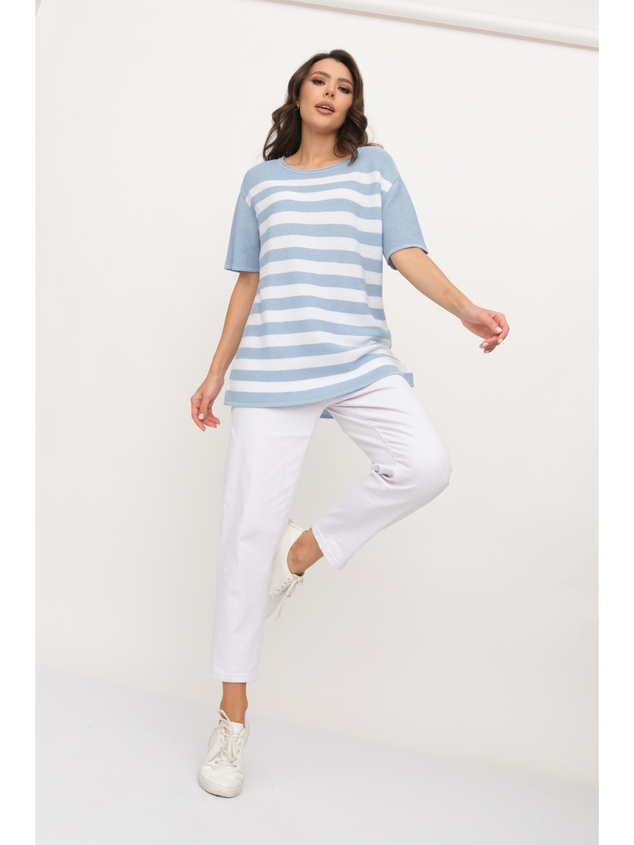 Женский трикотажный джемпер свободного силуэта. Рукав втачной короткий, вырез горловины круглый. Джемпер выполнен структурным кулирным переплетением.