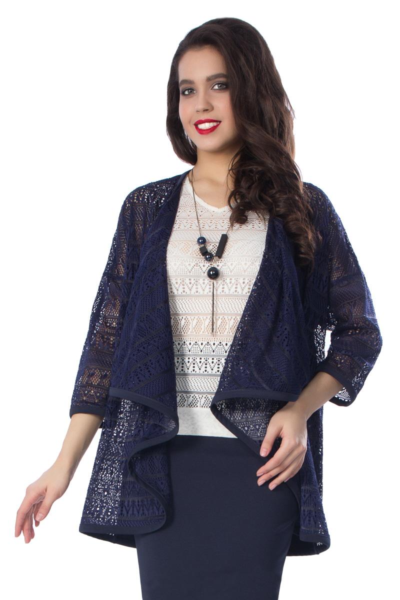 Воздушная накидка свободного силуэта темно-синего цвета. Перед изделия выполнен из трикотажного кружевного полотна. Спинка изделия выполнена из однотонного трикотажного полотна синего цвета. Края обработаны кантом в тон изделия. Втачной рукав со спущенной линией проймы.