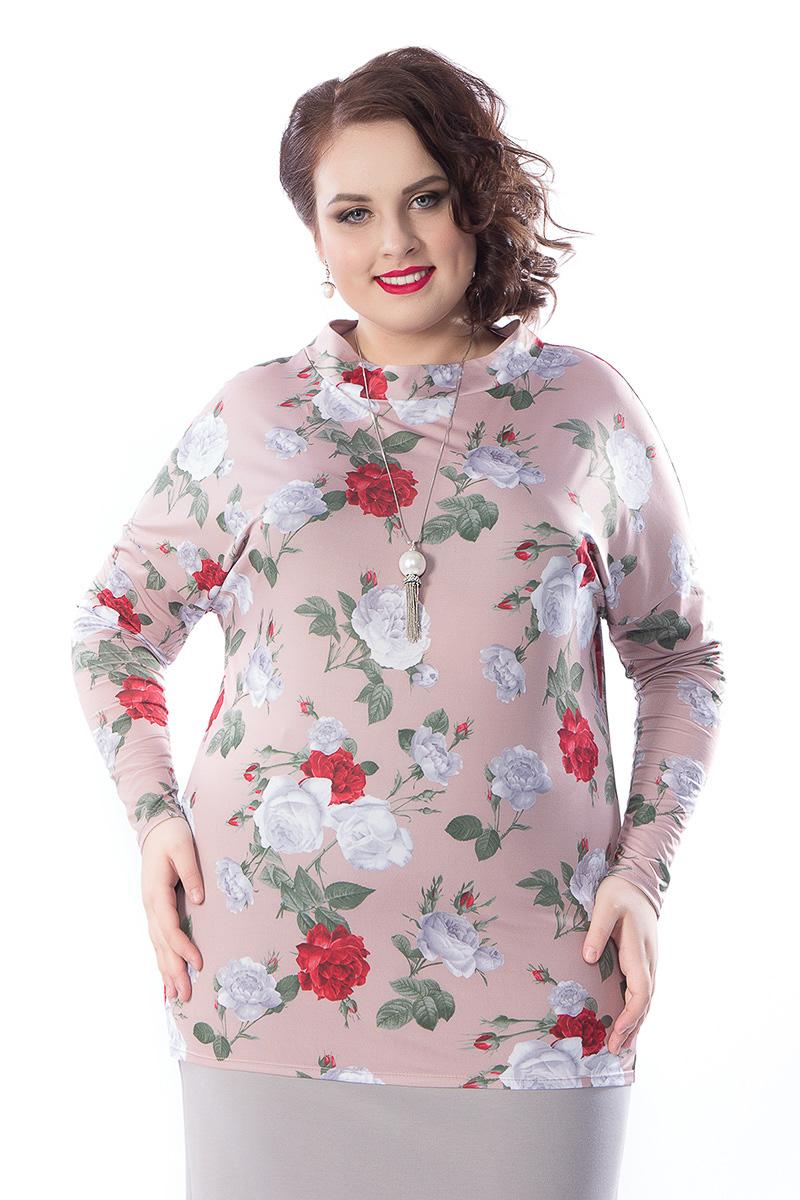 Стильный джемпер полуприлегающего силуэта из трикотажного полотна бежевого цвета с цветочным принтом. Изделие с воротником «полустойка» и втачными рукавами со спущенной линией проймы.