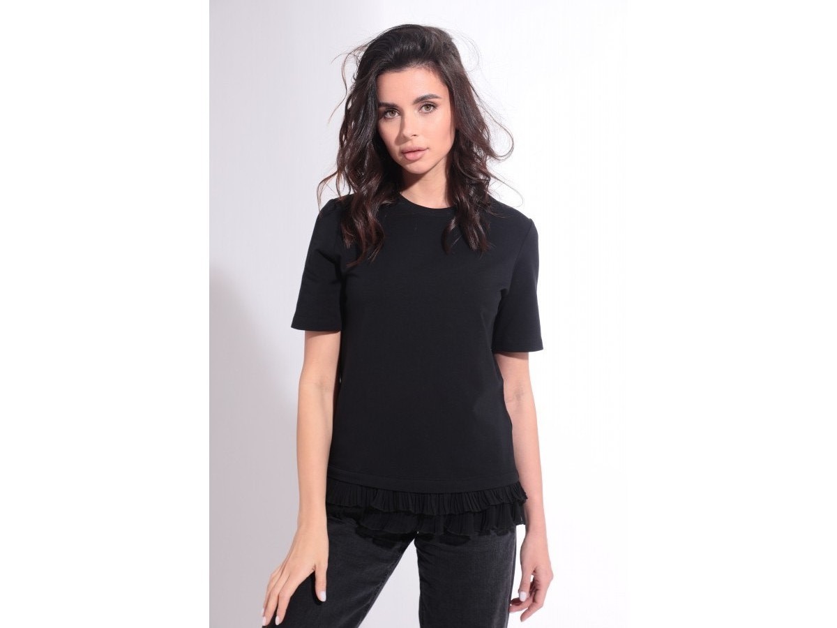 Стильная майка, в которой совмещено два стиля: спортивный и романтичный. Майка выполнена из натурального хлопкового футера 2-х нитка, благодаря чему очень приятна к телу. Рукав укороченный. Снизу майка украшена декоративной двубортной тканью-гофре. С этой майкой можно смело создавать стильные комбинации с другими вещами, а также разной по стилю обувью.