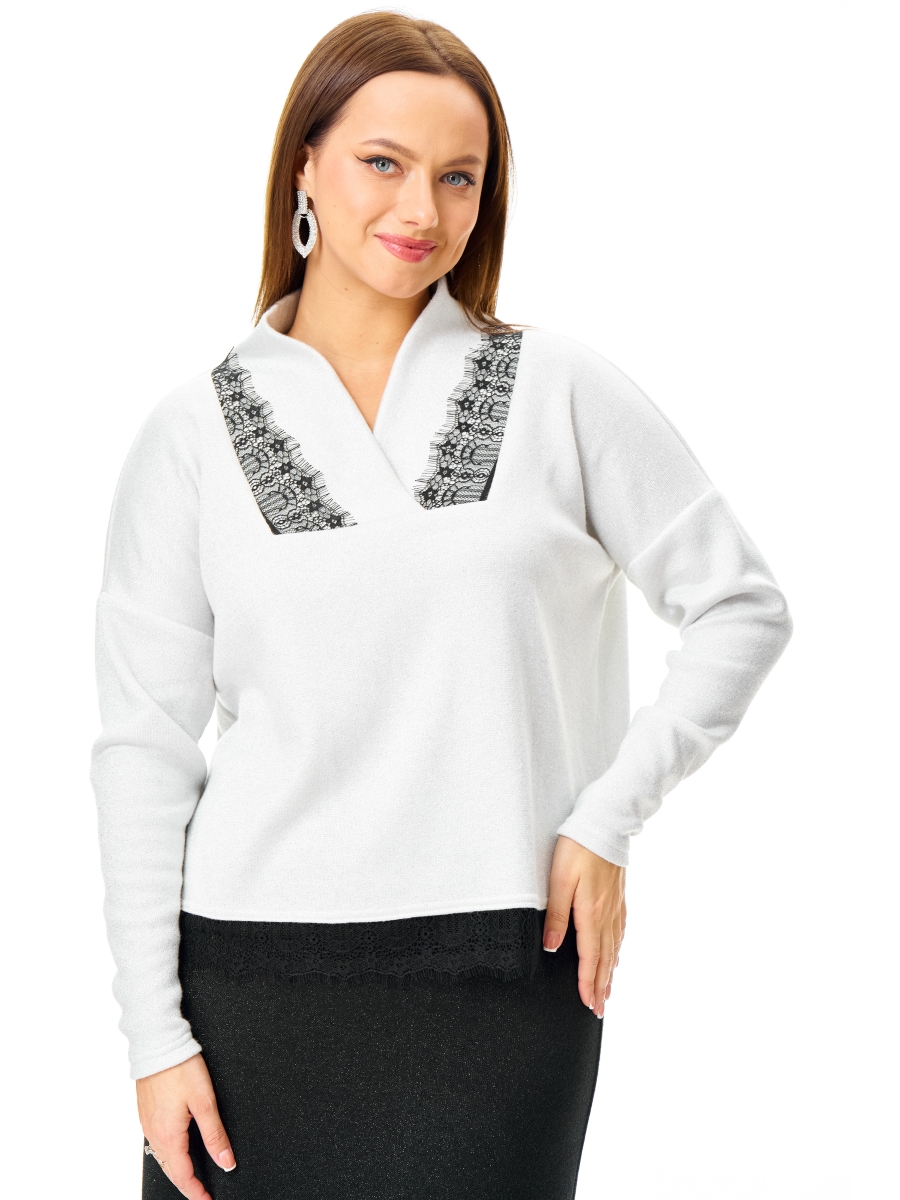 Уютный джемпер свободного силуэта. Воротник с глубоким запахом переходит в планку на груди. Рукав зауженный длинный. Воротник и низ переда с кружевной отделкой.