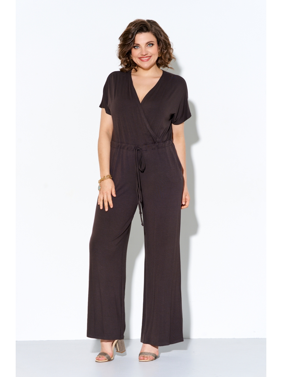 Комбинезон женский полуприлегающего силуэта выполнен из натурального вискозного трикотажа. Передняя часть комбинезона "на запах", в боковых швах карманы, по всей ширине линии талии вставлена резинка, которая переходит в кулиску-завязку.