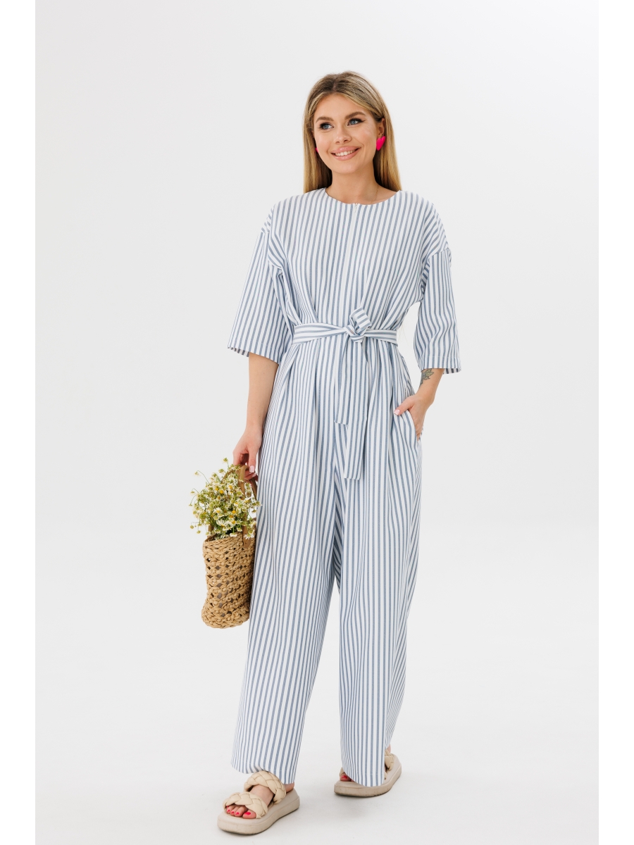 Комбинезон свободного силуэта со спущенным плечом и застежкой на потайную тесьму молнию с переди. Вырез горловины круглый. Рукав втачной длинный. В боковых швах действующие карманы. Пояс из основной ткани в комплекте.