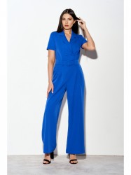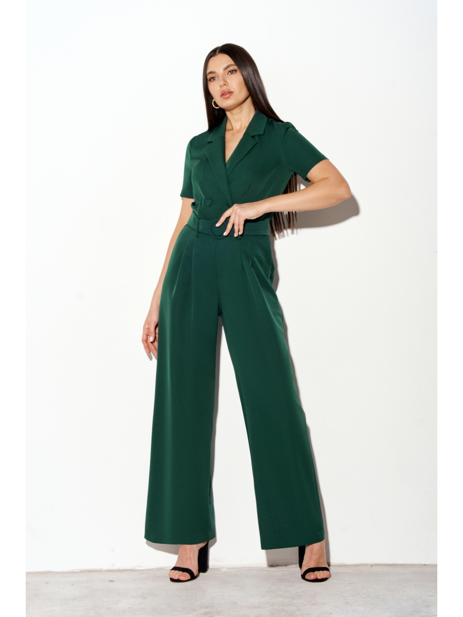 Комбинезон женский полуприлегающего силуэта со втачными рукавами, пиджачным воротником и мягкими складками по переду застегивается на молнию, петли и пуговицы; в боковых швах карманы.
