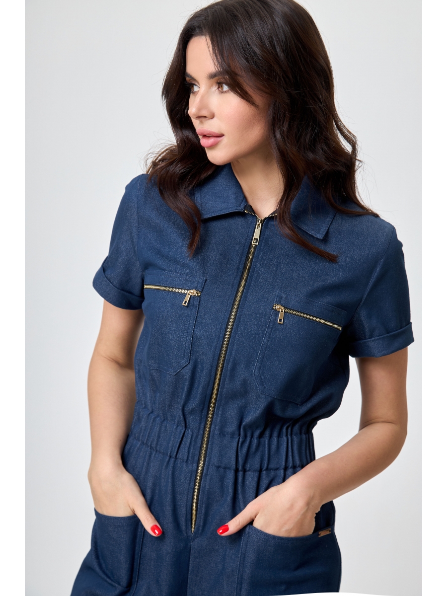 Комбинезон из белого легкого джинса - горячая новинка сезона! Комбинезон с шортами, с эластичным поясом, полуприлегающего силуэта, умеренного объема. По переду выполнены накладные нагрудные карманы на молнии, и боковые накладные карманы. На спинке оформлена отрезная кокетка Застежка доверху центральная на металлическую молнию. Воротник отложной рубашечного типа. Рукава втачные, одношовные, с отложной манжетой. По низу шорт также обработаны отложные манжеты. Пояс эластичный, с резинкой внутри.